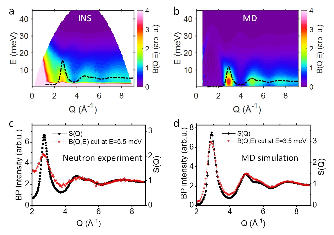 图1: Zr46Cu46Al8金属玻璃中玻色峰(BP)的动量依赖性。非弹性中子散射实验(INS)与分子动力学模拟(MD)揭示了玻色峰的两个独特“指纹”:其能量位于约5.5 meV,且不随动量Q变化而色散(a, b);玻色峰的强度与静态结构因子S(Q)高度相关(c, d),表明玻色峰与材料的静态结构存在内在联系。
